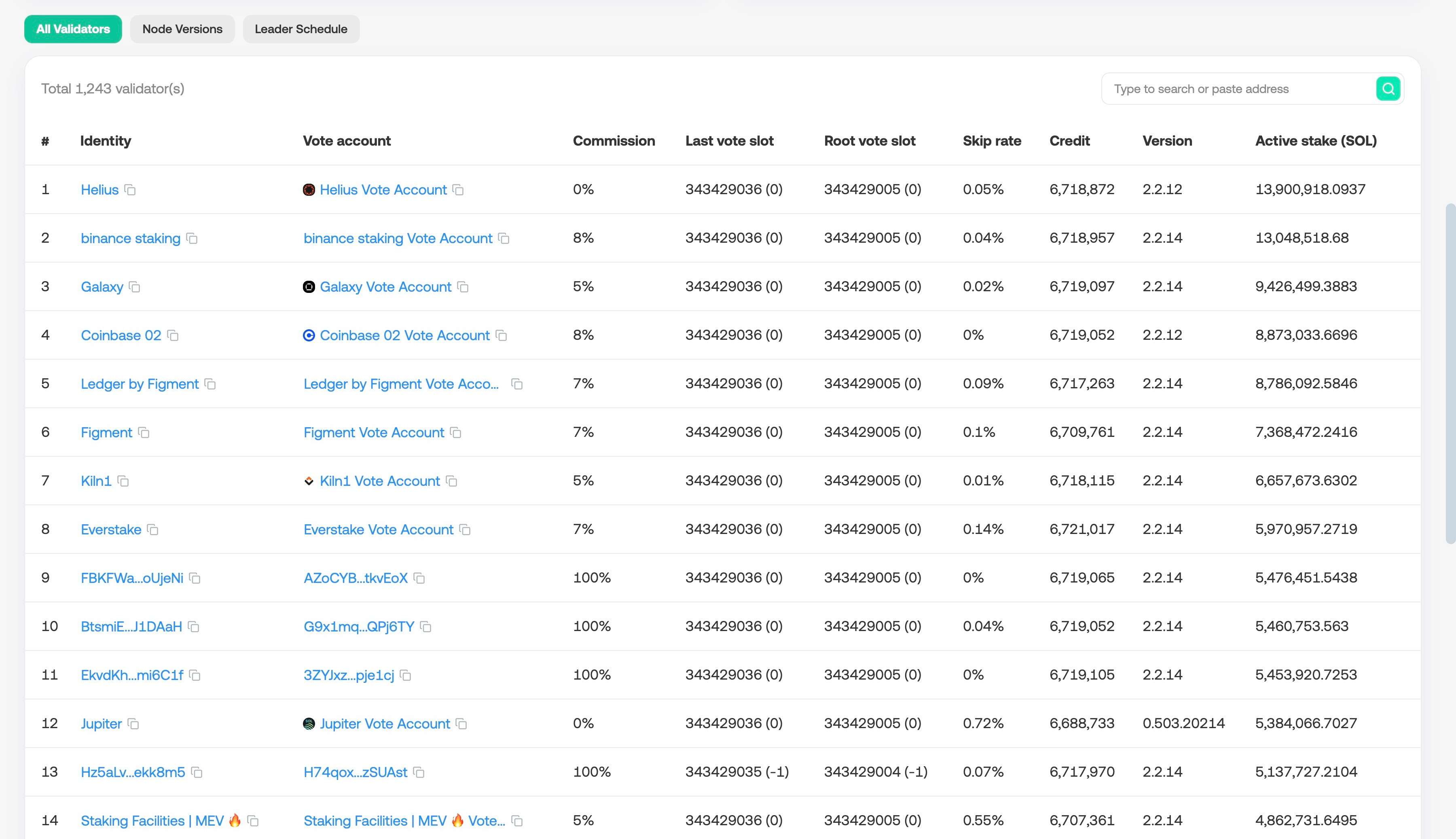 The image below shows the top 14 Solana validators, their commission, active SOL staked, and other parameters.