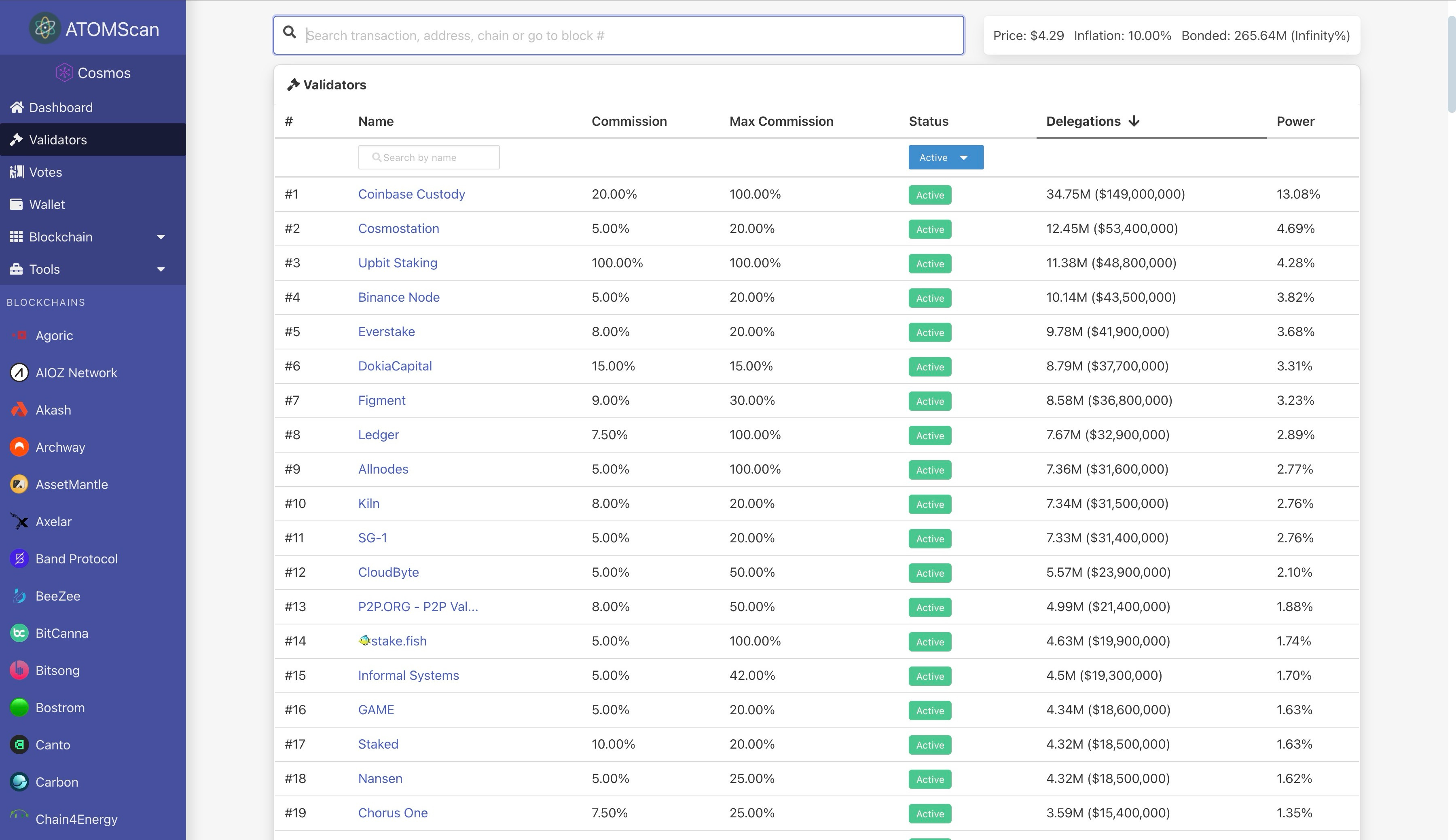 Thus, making the minimum stake any number of ATOM that puts you in the top 200 (Year 6). That value currently sits at 2,740 ATOM (~ 11,900 USD), which is the stake of the 198th validator.