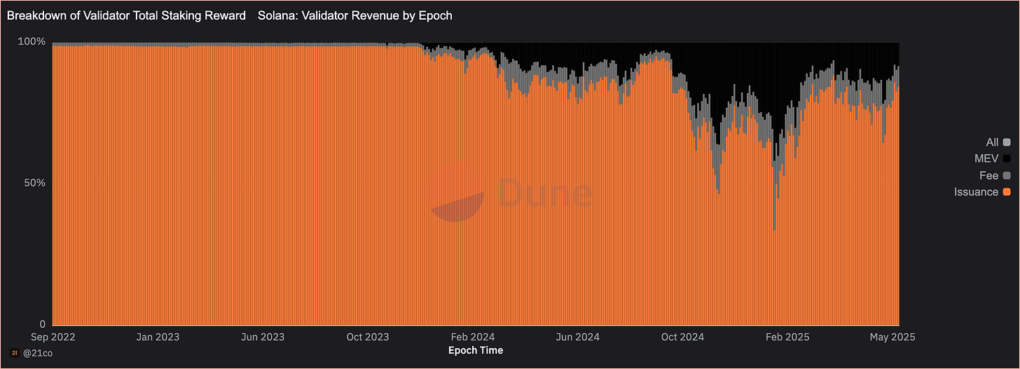 For earnings, Solana validators earn from inflation/issuance rewards (on their stake), priority fees (tips), and MEV. Most of the rewards come from issuance. However, tips also make up a good portion. According to Blockworks research, $240 million in priority fees/tips flowed to validators in Jan 2025 alone.